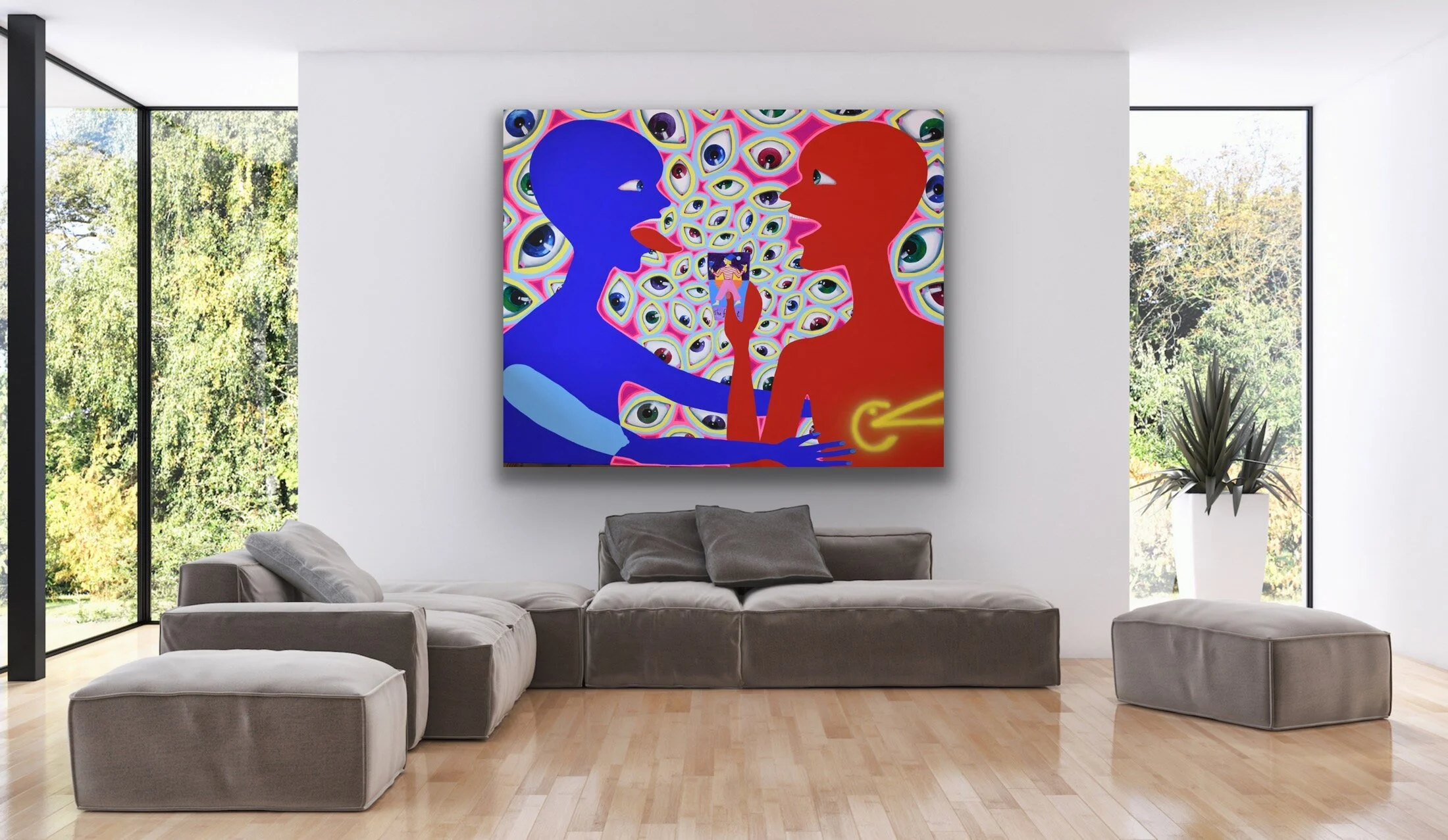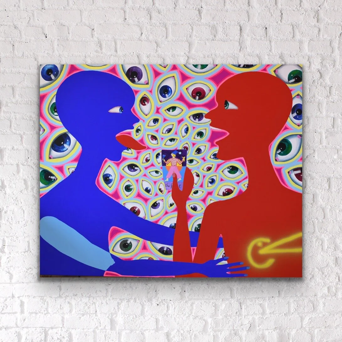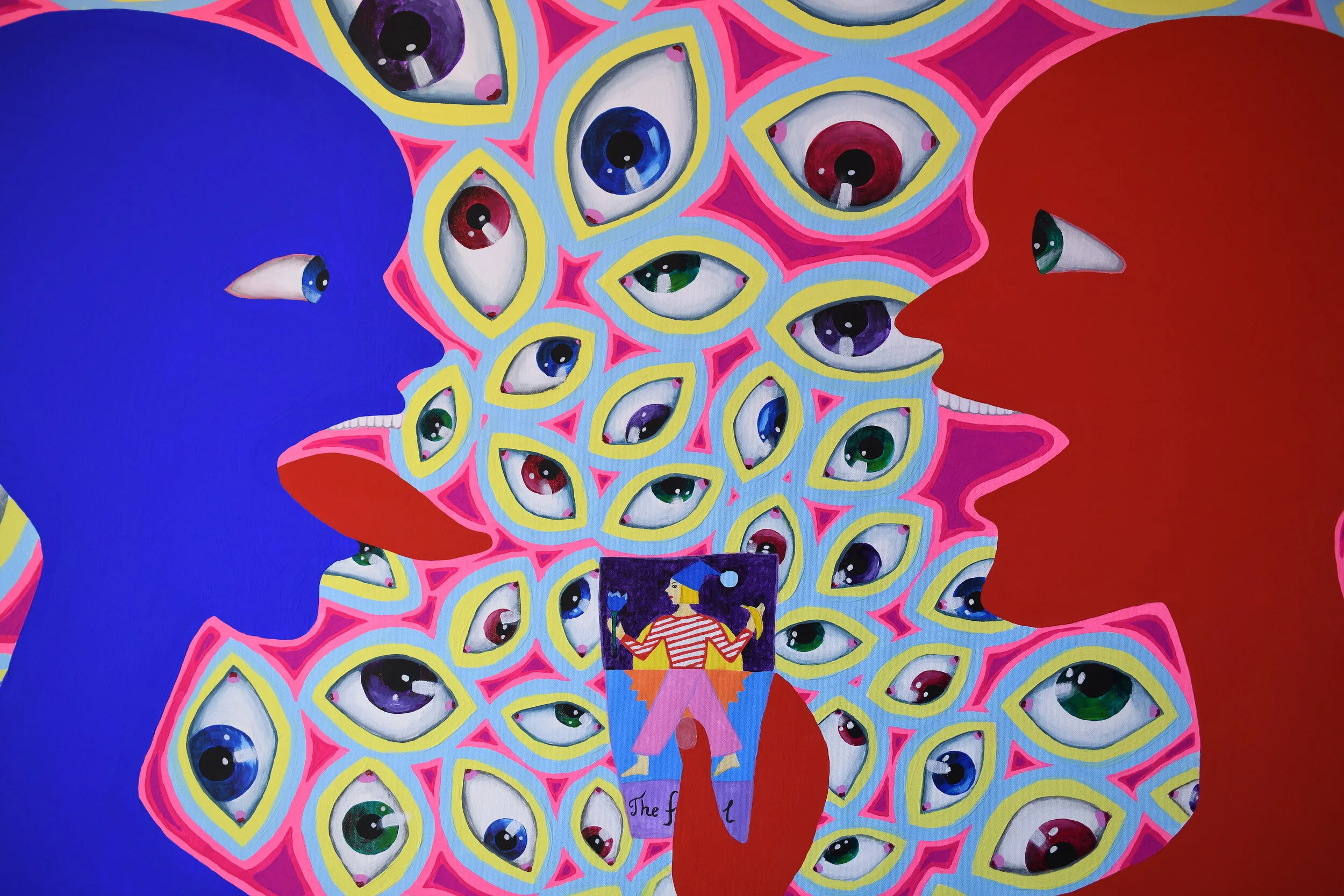 This work is all about suspense and hidden meaning which i leave up to you to guess. Two figures in the crowd, looking at each other, one is showing ambiguous taro card The Fool while the other sticking the tongue out. What might happen next?